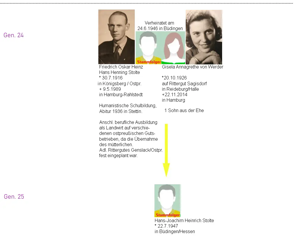 30.7.1916 geboren in Königsber/Ostpreußen als Sohn des Oberleutnant d. Res. der Feldartillerie, Heinrich Stolte und der Ehefrau und Gutsbesitzerin Genslack bei Königsberg, Charlotte Helene Stolte, geb. Mueller-West.